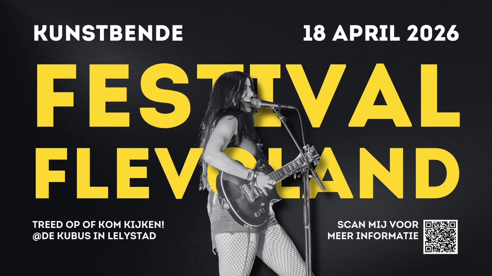Iedereen is welkom @ Kunstbende Festival in Flevoland! Op 18 april barst het feest los in en om De Kubus. Deelnemers van Kunstbende Flevoland showen hun performance in de categorieën Muziek, Taal, Expo, DJ, Dans, Fashion, Film en Theater. Maar er is nog veel meer: van lasergamen en een temporary tattoo bar tot retro games, een fotobooth en nog veel meer!