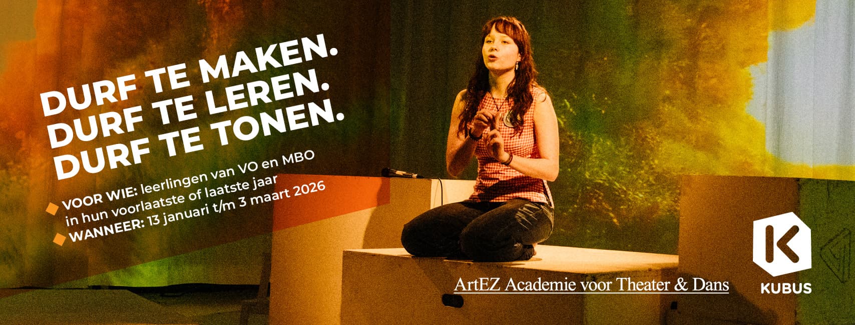 Ben jij graag bezig met theater, film, schrijven of presenteren? Ontdek of een kunstopleiding iets voor jou is tijdens dit 8-weekse traject van ArtEZ en De Kubus. Je werkt aan je eigen ideeën en verhalen, leert van échte docenten uit het vak en sluit het traject af met een certificaat van deelname.