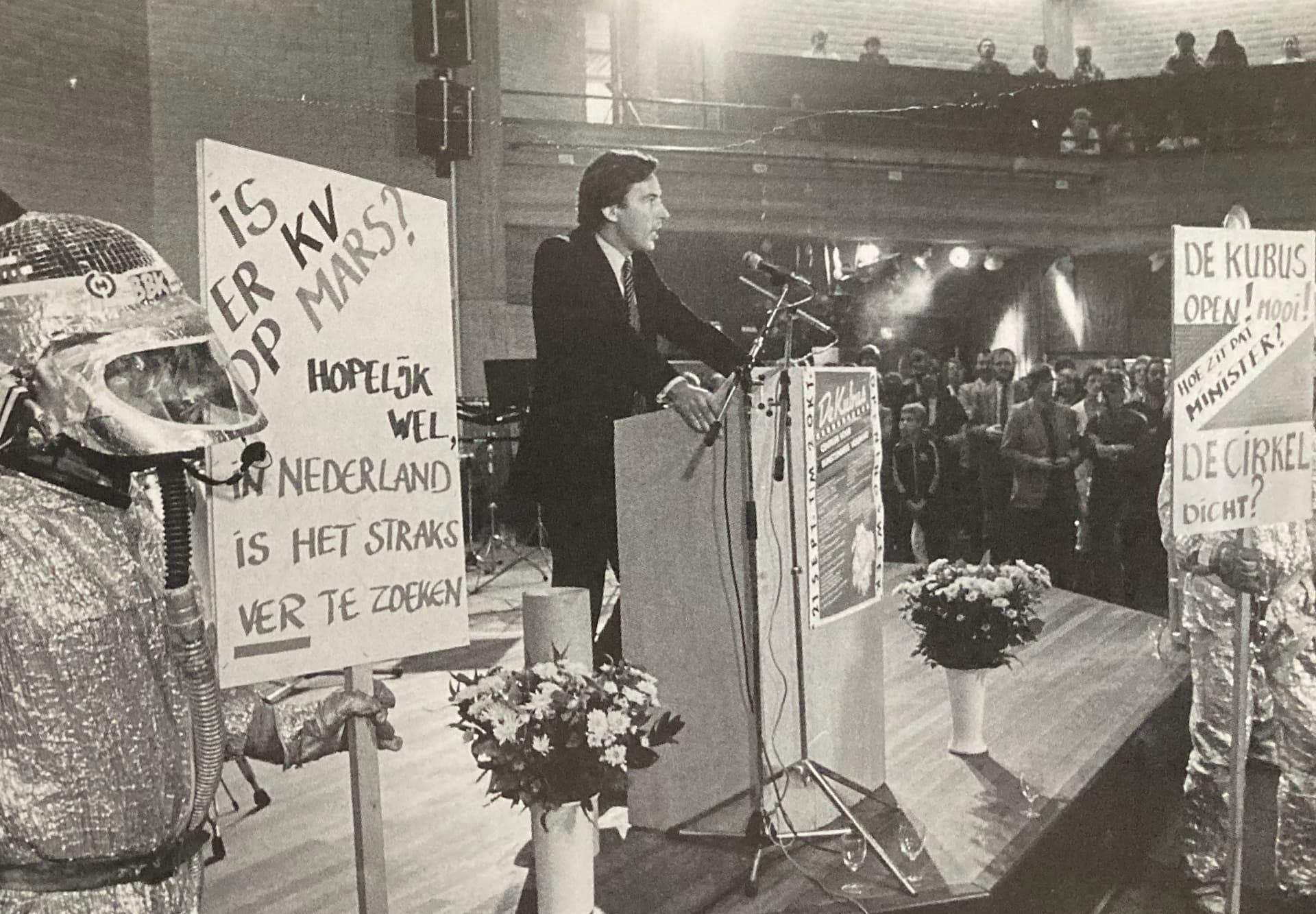 Opening van ‘De Kubus’ door minister Elco Brinkman. Met leuzen en gekleed in ruimtepakken probeerden medewerkers van het CKV de minister attent te maken op de nadelige gevolgen van zijn (bezuinigings)beleid.