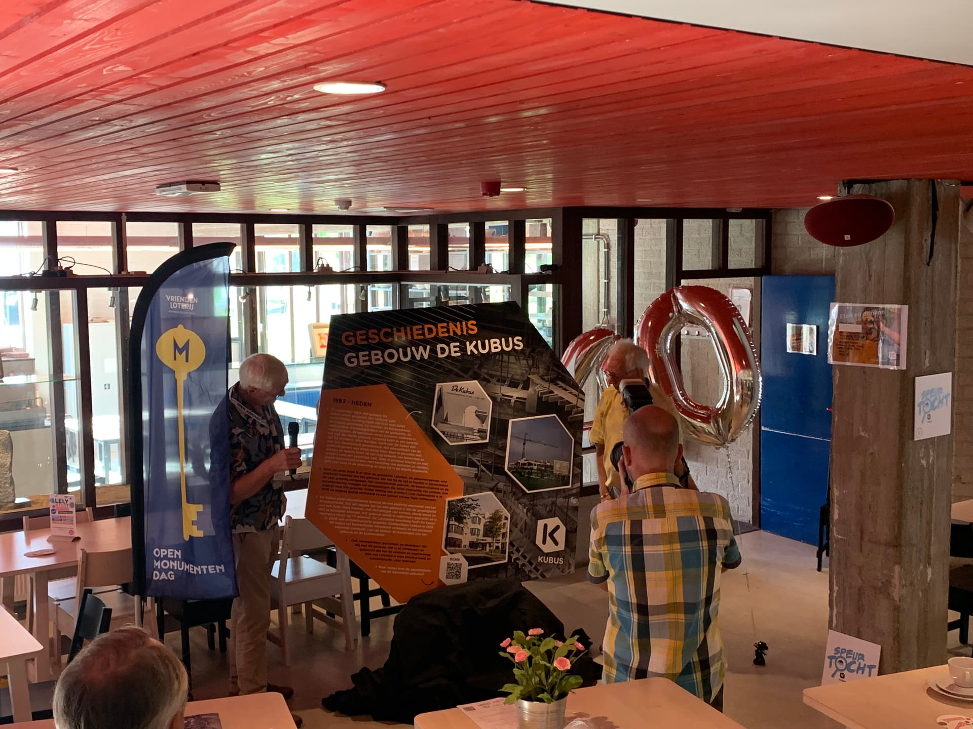 Onthulling informatiepaneel in de foyer van De Kubus door wethouder cultuur Sjaak Kruis. Deelname aan Open Monumentendag tijdens festival LelySTART met rondleidingen gericht op de bijzondere architectuur.