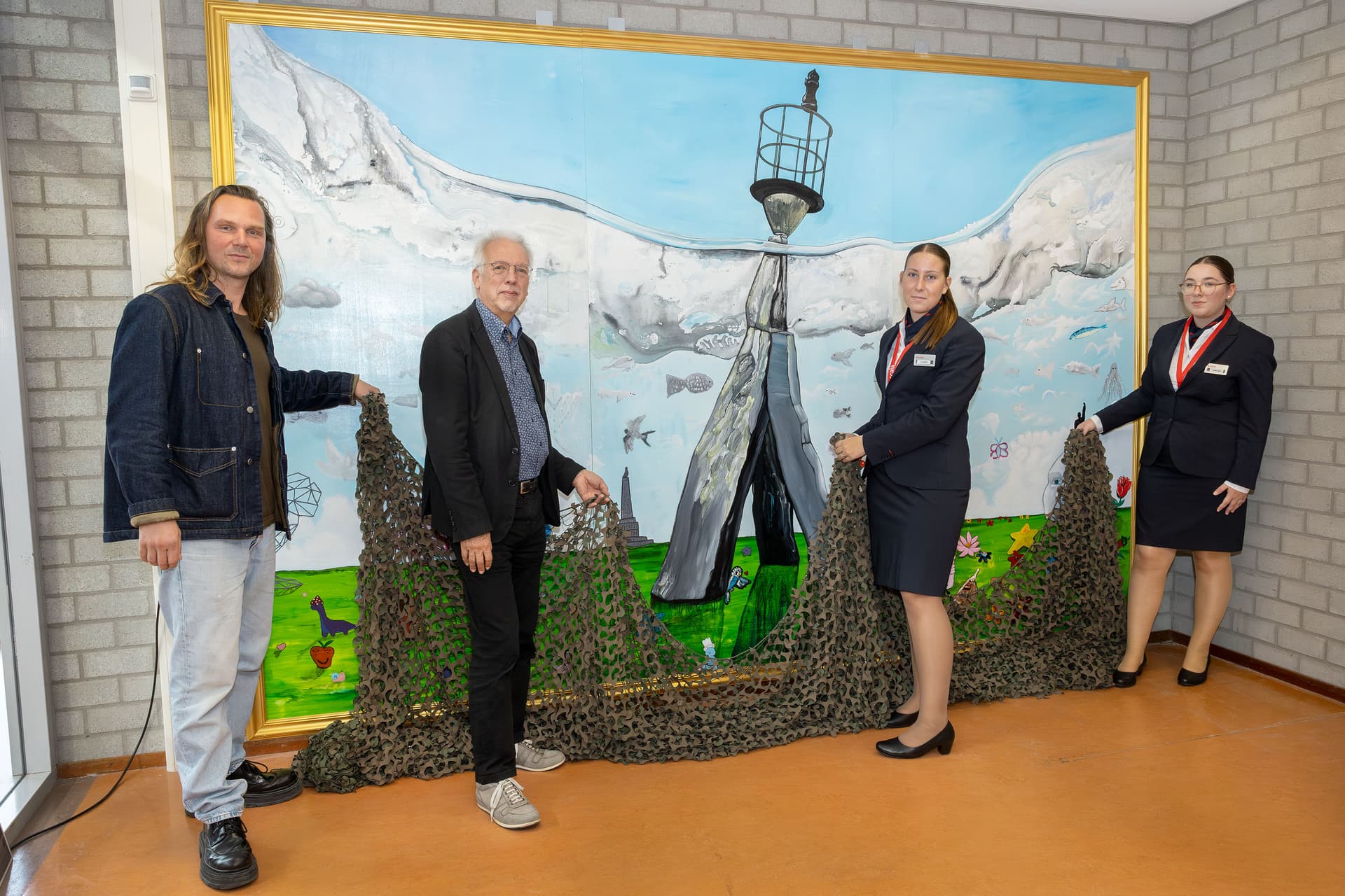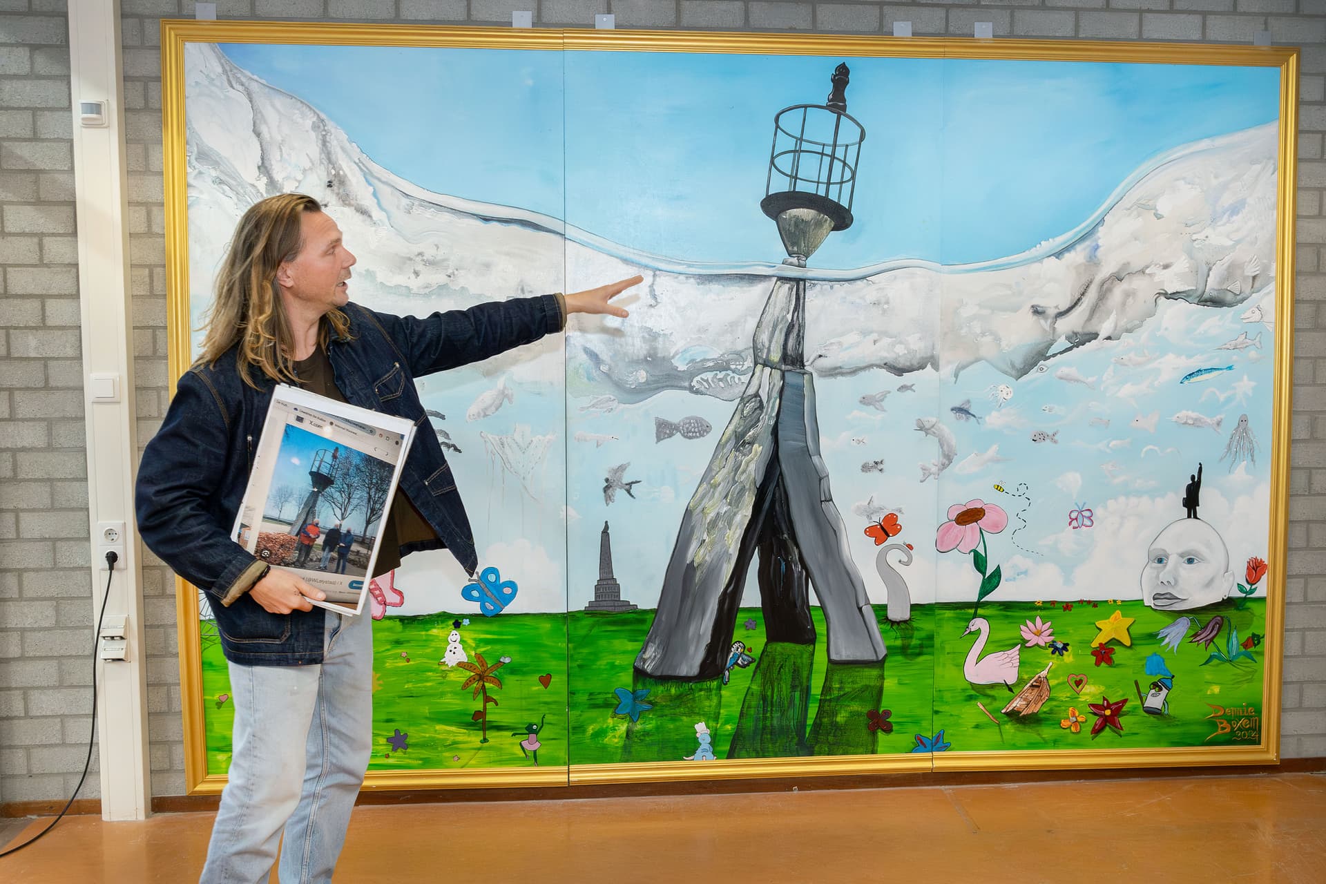 Kunstenaar Dennie Boxem vertelde over het proces achter het kunstwerk: “Het schilderij vertelt het verhaal van Lelystad, met als centraal symbool de meetpaal van het Werkeiland in Lelystad Haven. Studenten hebben tijdens het Taalfestival hun eigen verhaal bijgedragen door onder andere elementen toe te voegen die hun persoonlijke beleving van taal en de stad uitdrukten. Elk detail op het doek staat voor hun persoonlijke beleving van taal en de stad. In totaal werkten 300 studenten aan dit kunstwerk, en hun namen staan achterop het schilderij. Het is fantastisch om een collectief kunstwerk te zien dat nu een blijvende plek heeft op de school.”