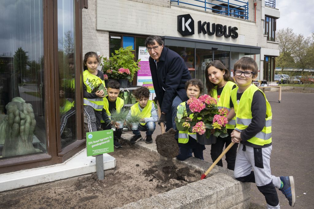 Senioren met groene vingers verzorgen samen met kinderen van BSO Kindercentrum Fitte Kanjers planten rondom het kunst- en cultuurcentrum De Kubus in Lelystad. Het contact tussen 55-plussers en kinderen staat hierbij centraal.