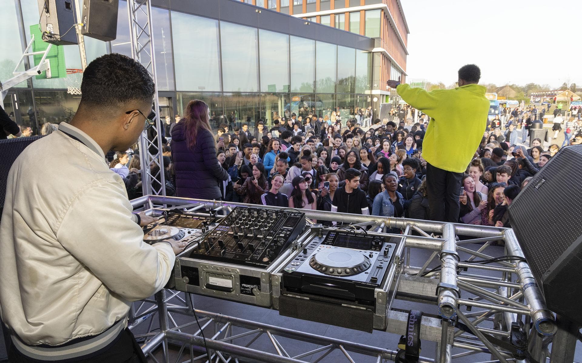 De eerste editie van het Porteum Podium Festival was een groot succes. Er was van alles te beleven op en rond het terrein van Porteum. Zo was er een luistertuin gecreëerd waar leerlingen naar verschillende podcastverhalen konden luisteren, stond op het terrein een foodtruck waar zij zich tegoed konden doen aan heerlijke poffertjes en was er een échte zweefmolen. Het enorme podium, dat speciaal voor het festival op het schoolplein werd opgebouwd, was niet alleen bedoeld voor optredens van bekende lokale artiesten. Ook leerlingen zelf kregen tijdens het festival de ruimte om hun schoolgenoten te laten zien wat ze in huis hebben.