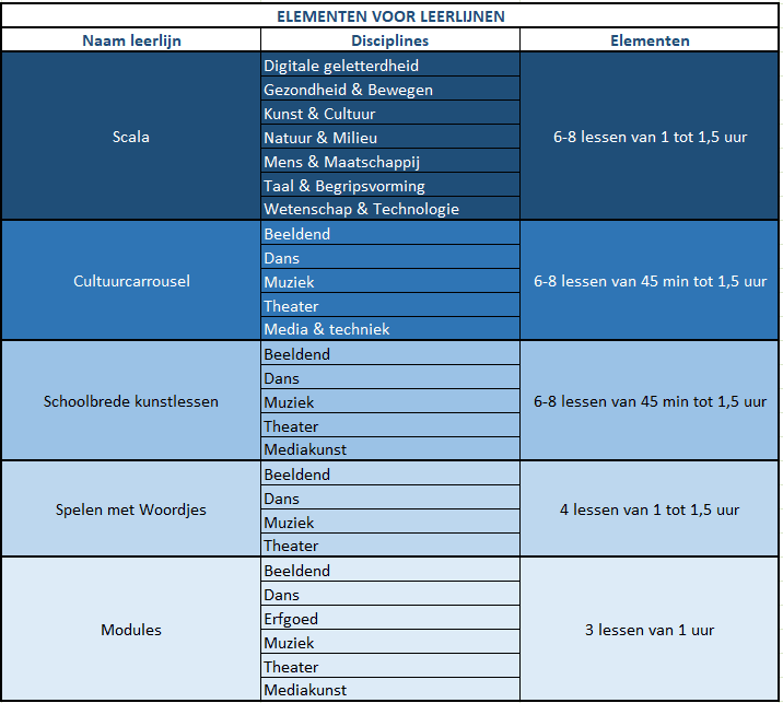 Elke school kan modules voor verschillende disciplines als leerlijn inzetten. Dat kan voor alle leeftijdsgroepen. Door disciplines te combineren krijgt de klas een gevarieerd cultuuraanbod. Elke module bestaat uit drie lessen, waarbij de eigen leerkracht twee lessen geeft en de kunstvakdocente één les. Het is ook mogelijk dat de kunstdocent alle lessen geeft. Bij de lessen van de kunstdocent blijft de leerkracht aanwezig in de klas om te zorgen dat de kunstdocent zijn of haar werk goed kan uitvoeren.