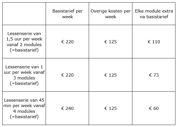 - Bij 4 groepen en 2 modules van 1,5 uur € 345 per week